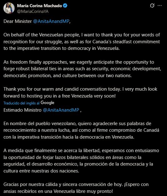 A través de una publicación en su cuenta de X, Machado expresó su agradecimiento a la ministra de Asuntos Exteriores canadiense, Anita Anand, por sus palabras de agradecimiento hacia la causa venezolana.