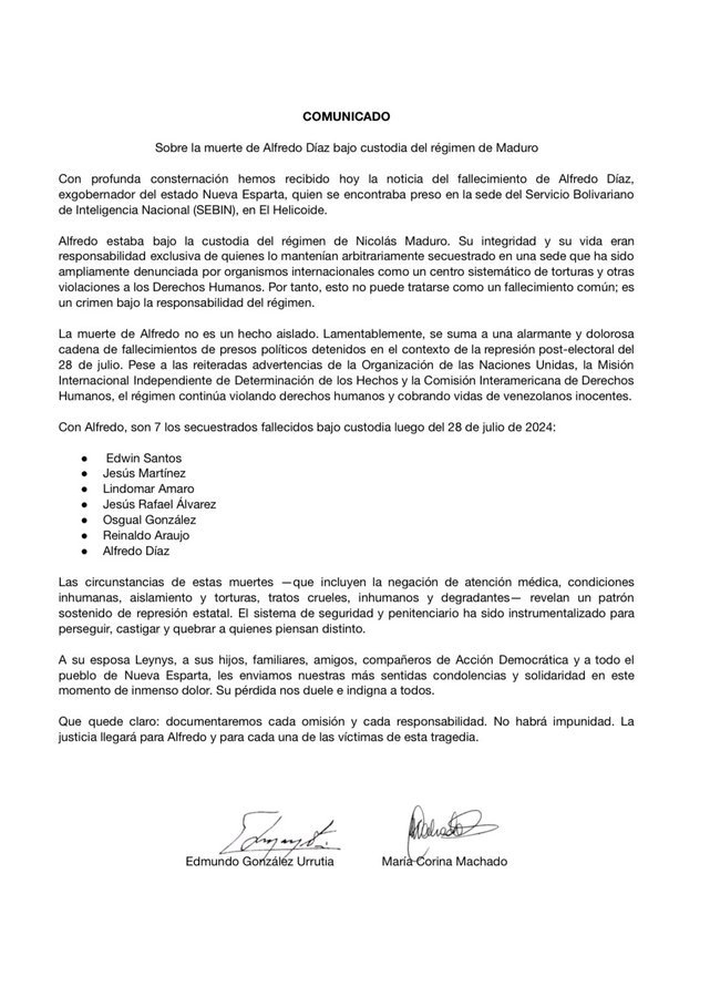 Los líderes de la oposición democrática María Corina Machado y Edmundo González Urrutia emitieron un comunicado conjunto expresando su profunda consternación por el fallecimiento de Alfredo Díaz, exgobernador del estado Nueva Esparta, ocurrido mientras se encontraba detenido en la sede del Servicio Bolivariano de Inteligencia Nacional (SEBIN), en El Helicoide.