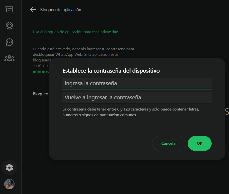 Mejora tu seguridad: Bloquea la app de WhatsApp desde el navegador Si perdiste o te robaron tu teléfono, puedes bloquear la aplicación de WhatsApp si tienes la sesión abierta en tu navegador. 1. Accede a la cuenta en WhatsApp Web y abre la configuración. 2. Ve a la opción de ‘Privacidad’ y busca “Bloqueo de aplicación”. Al elegir esta opción, se establecerá una contraseña para acceder a la cuenta en todos los dispositivos que la tengan. 3. Establece una contraseña y presiona el botón ‘OK’. De esta manera, podrás tener mayor control de tu cuenta y privacidad de tus chats.