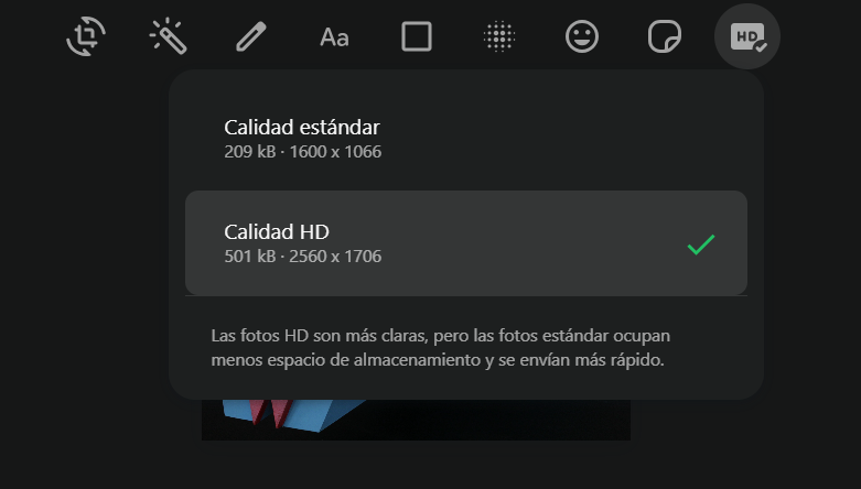 No más fotos borrosas, envíalas en HD Bien se sabe que al mandar fotografías y videos a través de WhatsApp se reduce su resolución. Esto sucede por la compresión automática que acorta el tamaño del archivo para su envío. La aplicación sacrifica la nitidez y detalle para acelerar el envío del archivo. Para las personas que utilizan fotografías o imágenes en su trabajo, y requieren enviarlas con rapidez, esto puede ser contraproducente. Sin embargo, ahora existe la función de enviar los archivos de fotos o video en definición HD de manera sencilla. 1. Busca el video o fotografía que vas a enviar y selecciónalo. 2. Una vez seleccionada, WhatsApp señalará distintas funciones para editar. Busca el recuadro “HD – Calidad de la foto”. 3. Cambia la opción de ‘estándar’ a ‘HD’. La aplicación señalará la diferencia de peso y resolución de ambas formas. 4. Envía el archivo.