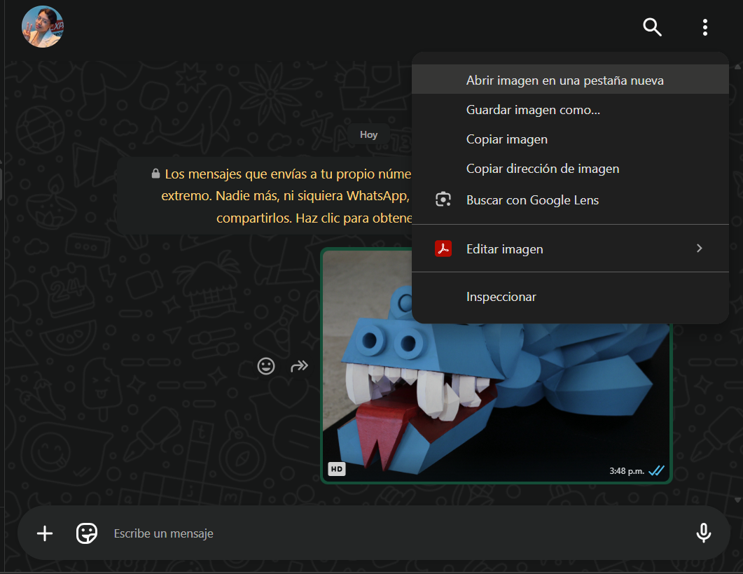 Revisa fotografías en una nueva pestaña Siguiendo la línea de quienes trabajan con imágenes y necesitan revisarlas antes de avanzar, puede ser útil ver la imagen aparte sin descargarla. Esta función está orientada para WhatsApp Web. 1. Abre el chat donde tienes la fotografía. Da clic derecho sobre la imagen. 2. Selecciona la opción “Abrir la imagen en una pestaña nueva”. 3. Tendrás la imagen en una nueva página para que la revises con detenimiento.