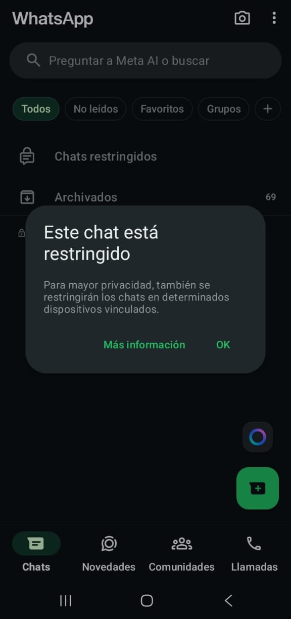 ¿Tienes un chat confidencial? Restringe su acceso con códigos En casos en que una conversación necesite una barrera adicional de seguridad, existe la función de restringir chats para permitir su acceso con una contraseña, ya sea un patrón, PIN, contraseña o datos biométricos. 1. Abre tu aplicación y selecciona el chat que quieras hacer confidencial. 2. Selecciona los tres puntos del menú que aparezca y busca la opción ‘Restringir chat’. 3. Presiona en Continuar y confirma la acción con el método de bloqueo que usas en tu teléfono móvil. 4. En tu pantalla principal de WhatsApp aparecerá una sección de Chats restringidos, y podrás acceder solamente con la contraseña o forma de bloqueo que tengas. También es posible ocultar la sección de tu pantalla principal, al activar el Código Secreto.