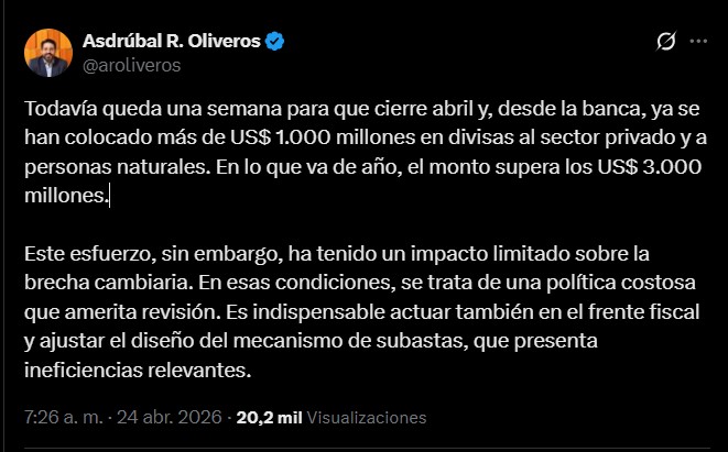 El economista Asdrúbal Oliveros aseguró este viernes que, en lo que va de abril, desde la banca ya se han colocado más de 1.000 millones de dólares en divisas dirigidas al sector privado y a personas naturales.