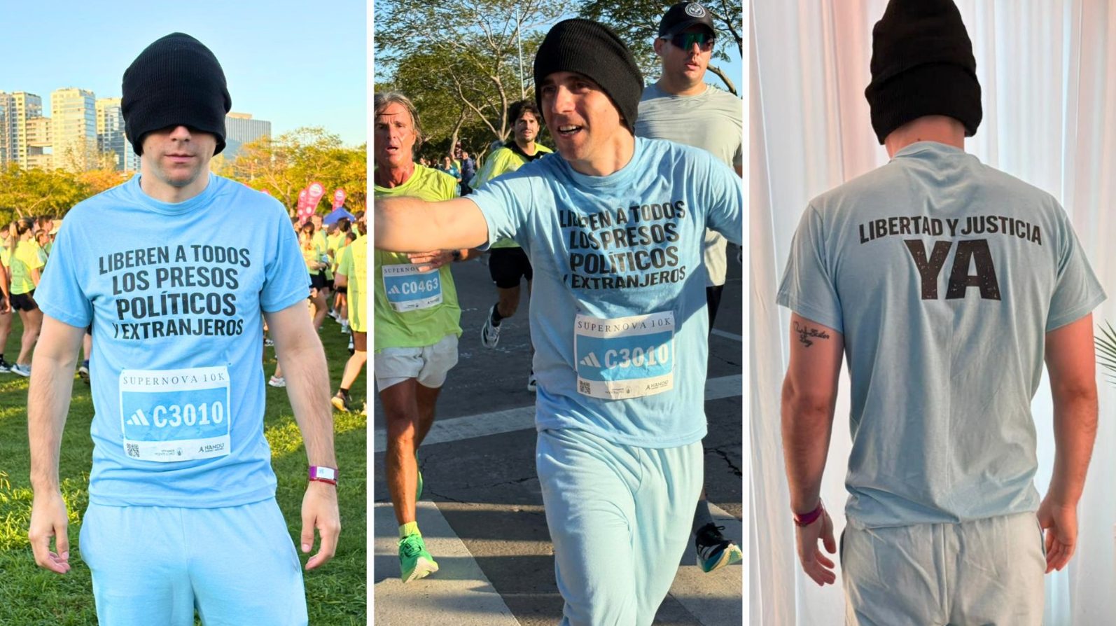 El gendarme argentino Nahuel Gallo participó este domingo en la carrera Supernova 10K, en Vicente López, provincia de Buenos Aires, vestido con el tradicional uniforme azul celeste que obligan a llevar a los presos políticos en la cárcel de El Rodeo 1 y otros centros de tortura en Venezuela.