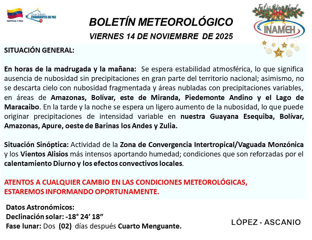 Según el reporte, se espera estabilidad atmosférica y ausencia de precipitaciones en gran parte del territorio nacional en horas de la mañana. Sin embargo, no se descartan cielos con nubosidad fragmentada y áreas nubladas con lluvias variables en zonas de Amazonas, Bolívar, este de Miranda, Piedemonte Andino y el Lago de Maracaibo.
