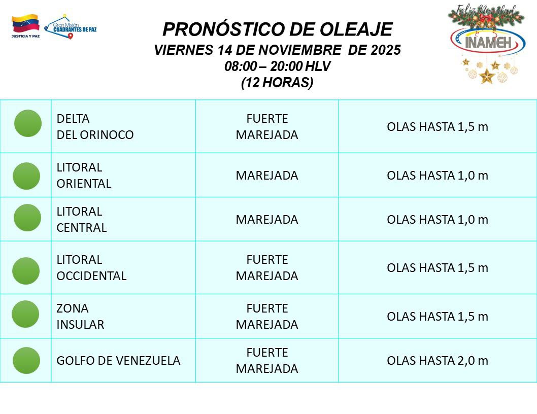 El Instituto Nacional de Meteorología e Hidrología (Inameh) informó que Venezuela presenta condiciones atmosféricas variadas y y oleaje significativo en el mar territorial este 14 de noviembre.
