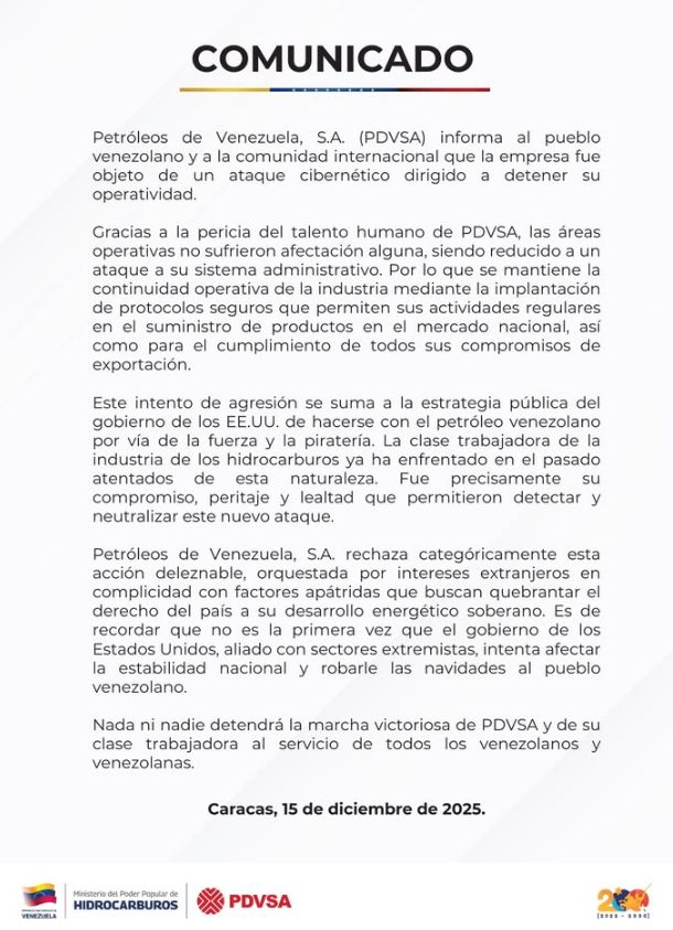 Sin embargo, gracias a «la pericia del talento humano de Pdvsa, las áreas operativas no sufrieron afectación alguna, siendo reducido a un ataque a su sistema administrativo», según el texto.