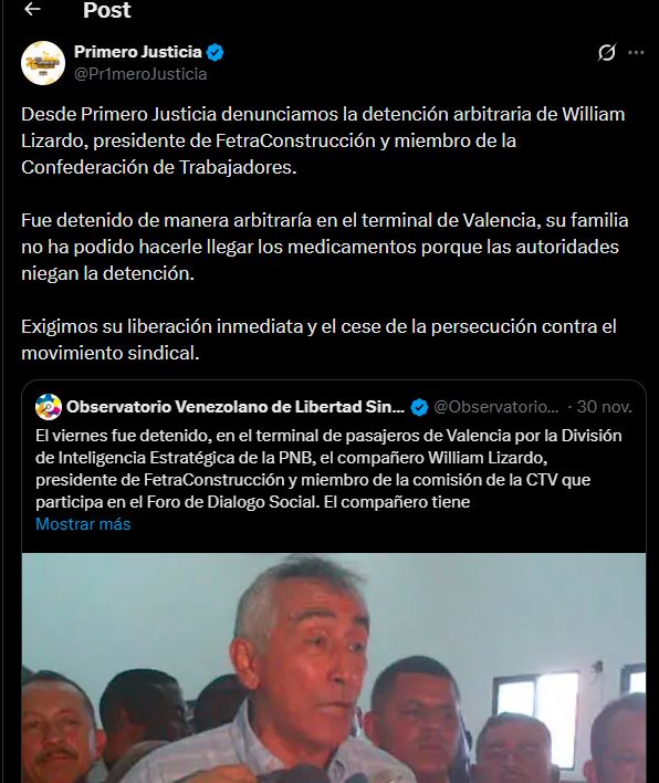 El partido opositor Primero Justicia denunció este lunes la detención arbitraria de William Lizardo, presidente de FetraConstrucción y miembro de la Confederación de Trabajadores de Venezuela (CTV), ocurrida en el terminal de pasajeros de Valencia.