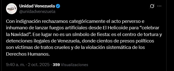En un mensaje difundido este jueves 2 de octubre a través de su cuenta en X, la coalición opositora calificó como un “acto perverso e inhumano” utilizar ese espacio para una celebración, recordando que el Helicoide no es un símbolo de fiesta, sino el principal centro de detenciones ilegales y torturas en Venezuela.