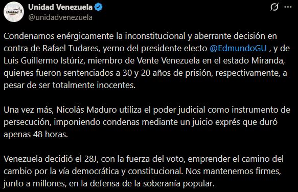La Plataforma Unitaria Democrática (PUD) rechazó este jueves las condenas inconstitucionales dictadas contra Rafael Tudares, yerno del presidente electo Edmundo González, y Luis Guillermo Istúriz, dirigente de Vente Venezuela en el estado Miranda, quienes fueron sentenciados a 30 y 20 años de prisión, respectivamente, pese a que son inocentes.