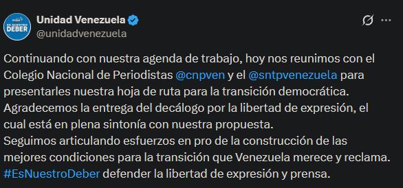 “Seguimos articulando esfuerzos en pro de la construcción de las mejores condiciones para la transición que Venezuela merece y reclama. Es nuestro deber defender la libertad de expresión y prensa”, señaló.