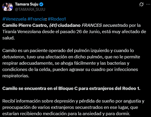 «Camilo Pierre Castro, (41) ciudadano FRANCES secuestrado por la tiranía venezolana desde el pasado 26 de junio, está muy afectado de salud», denunció Suju en una publicación.