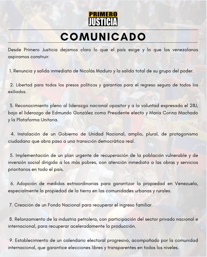 A través de un comunicado compartido en su cuenta de X, PJ reclamó como primer punto renuncia y salida inmediata de Nicolás Maduro, así como la separación total de su grupo del poder. A esto suma la libertad plena para todos los presos políticos y garantías para el regreso seguro de los venezolanos exiliados, medida que consideran indispensable para iniciar cualquier proceso de reconstrucción democrática.