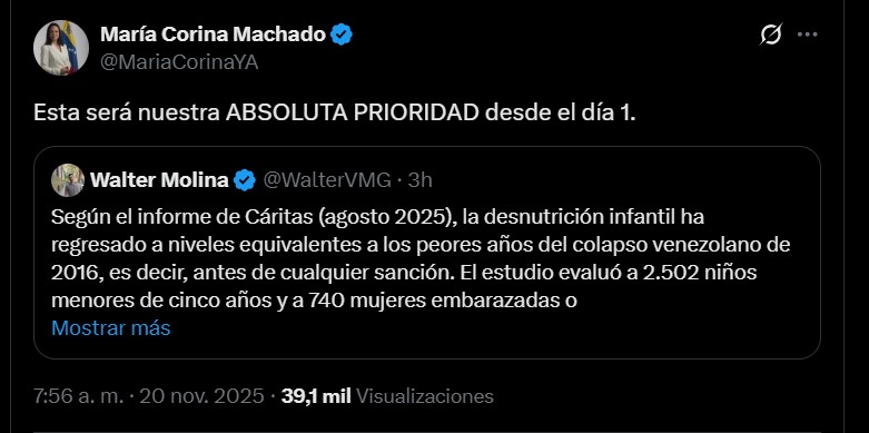La líder opositora venezolana María Corina Machado reaccionó con firmeza al nuevo informe de Cáritas Venezuela que revela un retroceso devastador en los niveles de desnutrición infantil en el país.