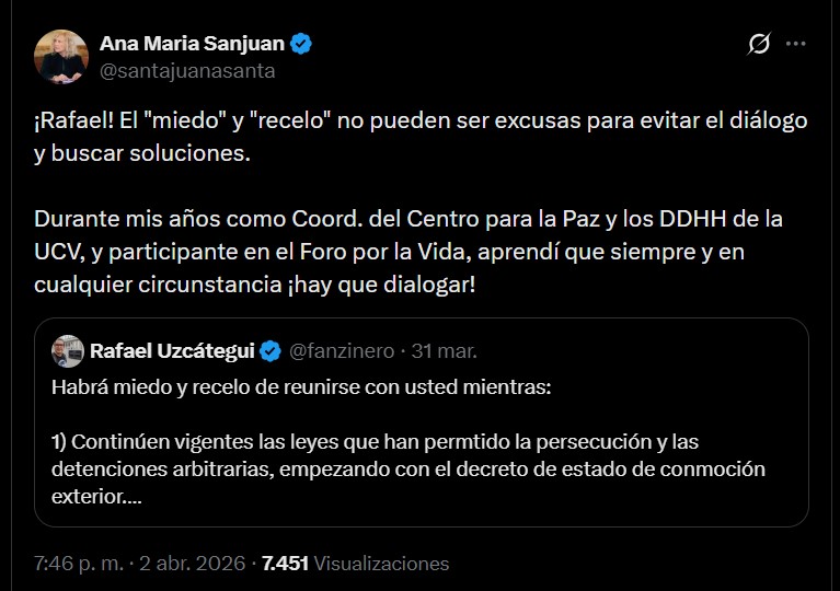 A través de un intercambio en la red social X, Uzcátegui sostuvo que antes de hablar de acuerdos es necesario crear garantías reales para que profesores, estudiantes y trabajadores puedan expresarse libremente. “Genere las condiciones para que el diálogo pueda desarrollarse en condiciones y sin miedo. Es pedagogía elemental”, escribió.