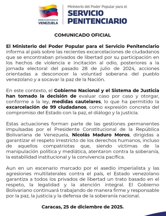 El Ministerio para el Servicio Penitenciario administrado por el chavismo confirmó este jueves la excarcelación de 99 personas que habían sido detenidas tras las elecciones presidenciales de 2024, en un contexto de crisis política marcado por el fraude de Nicolás Maduro.
