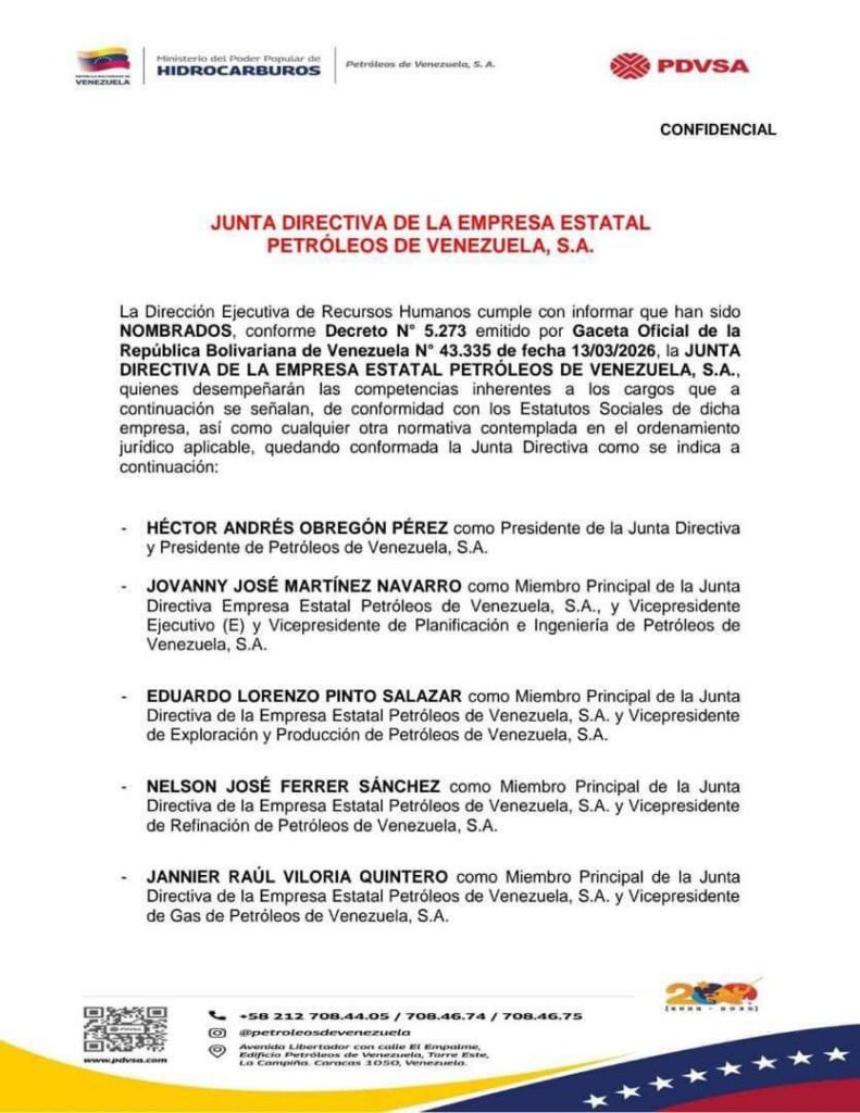 La empresa estatal Petróleos de Venezuela (Pdvsa) anunció la conformación de su nueva junta directiva mediante un comunicado emitido de forma confidencial. El régimen chavista publicó los nombramientos a través del Decreto N° 5.273 en la Gaceta Oficial N° 43.335, con fecha del 13 de marzo, donde ratificó a Héctor Obregón en la presidencia de la compañía.