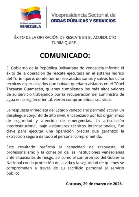 El régimen chavista informó este domingo 29 de marzo sobre el desenlace de una operación de salvamento ejecutada en el sistema hídrico del Turimiquire, logrando extraer sanos y salvos a ocho técnicos especializados que habían quedado aislados mientras realizaban labores para restituir el servicio de agua en el oriente del país.