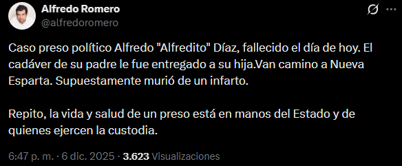 El director de la ONG Foro Penal, Alfredo Romero, informó este sábado 6 de diciembre que el cuerpo del exgobernador y preso polÃtico, Alfredo «Alfredito» DÃaz, fue entregado a sus familiares tras confirmarse su fallecimiento bajo custodia del régimen chavista.