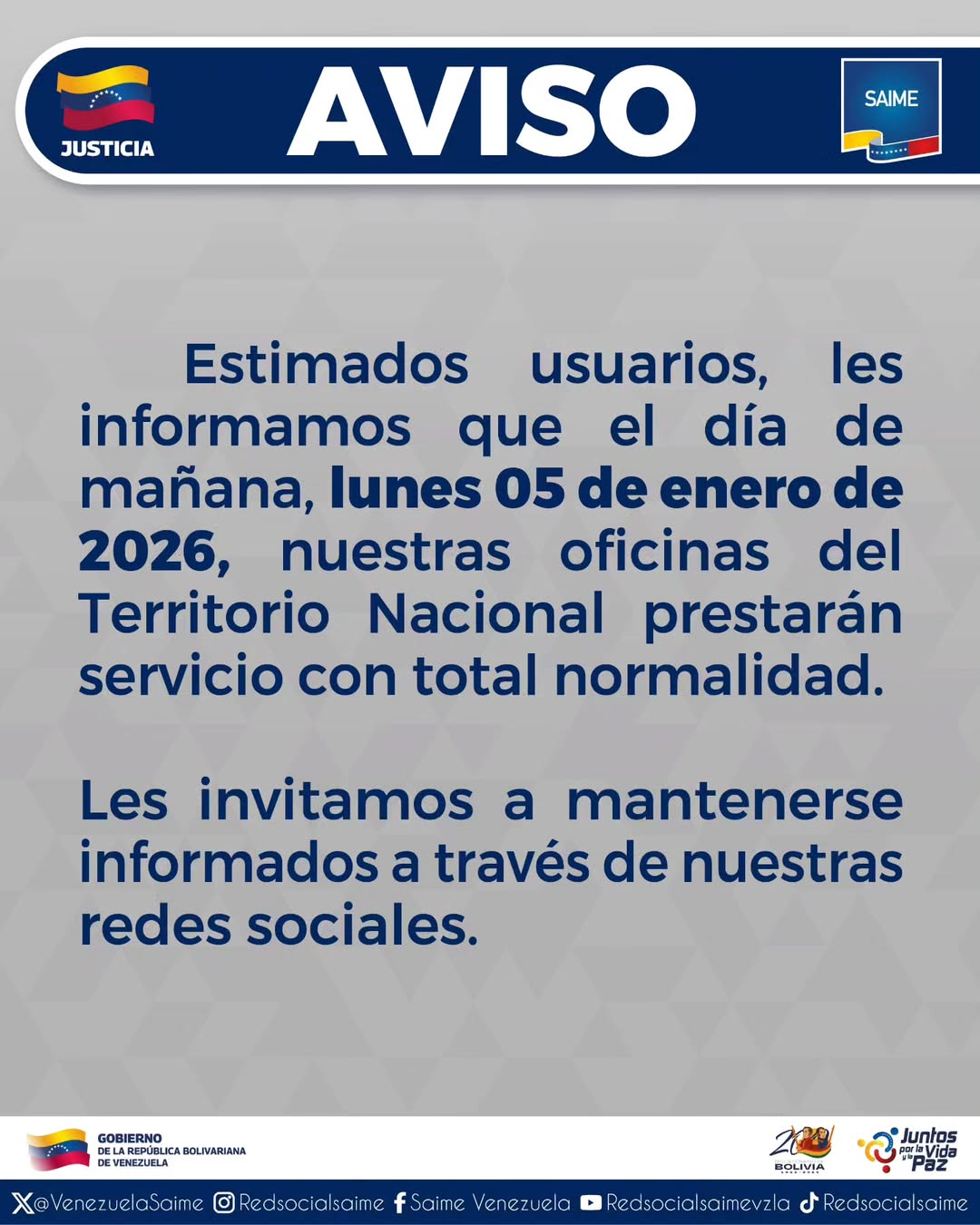 El Servicio Administrativo de Identificación, Migración y Extranjería de Venezuela (Saime) anunció este domingo que abrirán este próximo lunes todas sus oficinas en el territorio nacional.