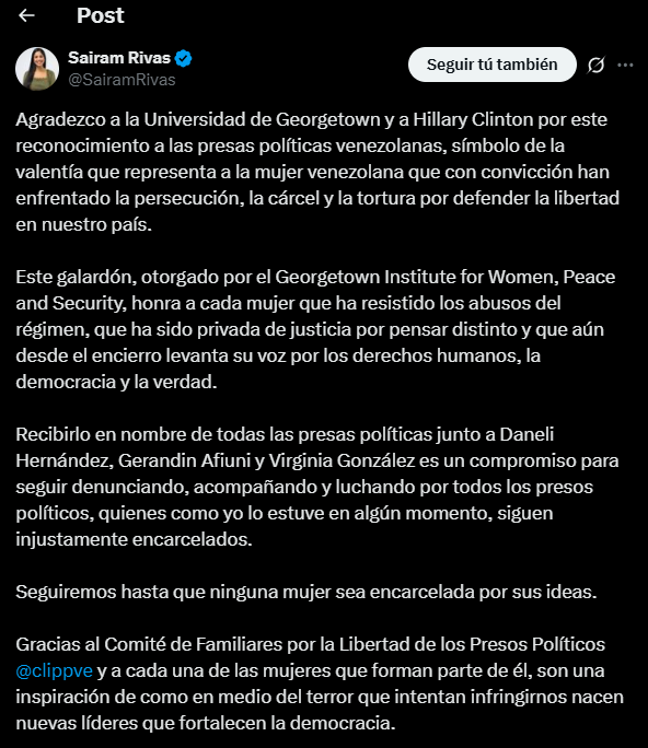 En un mensaje publicado en su cuenta oficial en X (antes Twitter), Sairam Rivas dijo: “Agradezco a la Universidad de Georgetown y a Hillary Clinton por este reconocimiento a las presas políticas venezolanas, símbolo de la valentía que representa a la mujer venezolana que con convicción han enfrentado la persecución, la cárcel y la tortura por defender la libertad en nuestro país”.