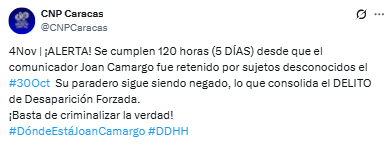 «¡ALERTA! Se cumplen 120 horas (5 DÍAS) desde que el comunicador Joan Camargo fue retenido por sujetos desconocidos el #30Oct. Su paradero sigue siendo negado, lo que consolida el DELITO de Desaparición Forzada. ¡Basta de criminalizar la verdad!», escribió el CNP