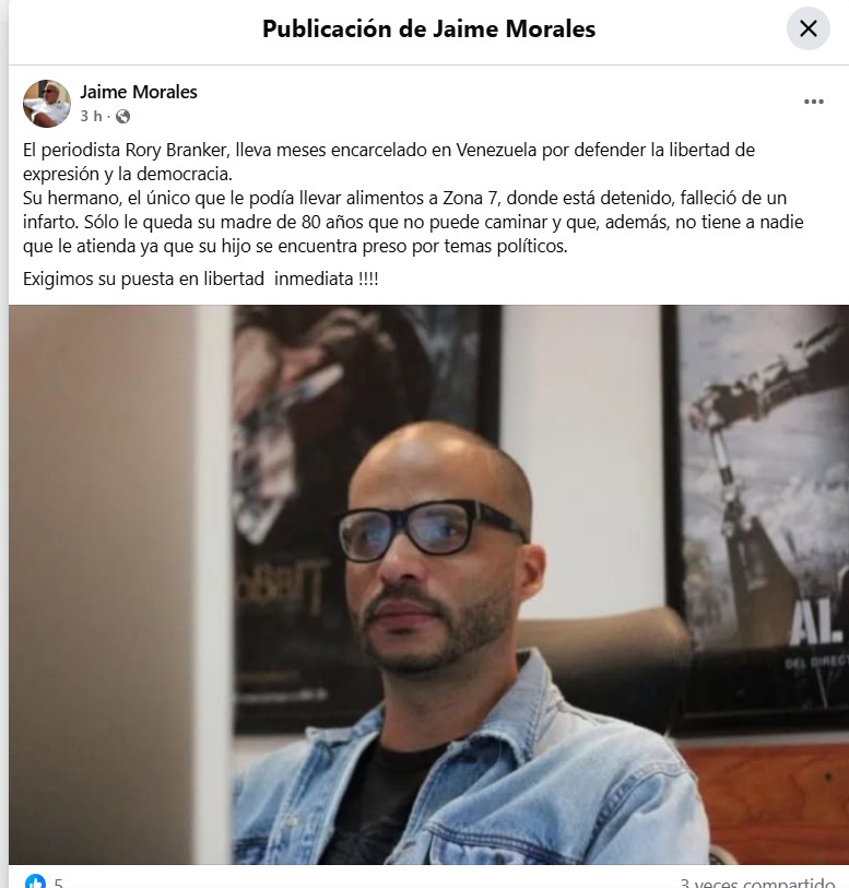 Branker es uno de varios trabajadores de la prensa detenidos en Venezuela, a menudo bajo acusaciones genéricas de «terrorismo» o «incitación al odio»—cargos que la oposición y activistas denuncian como tácticas para silenciar a las voces críticas y disidentes.