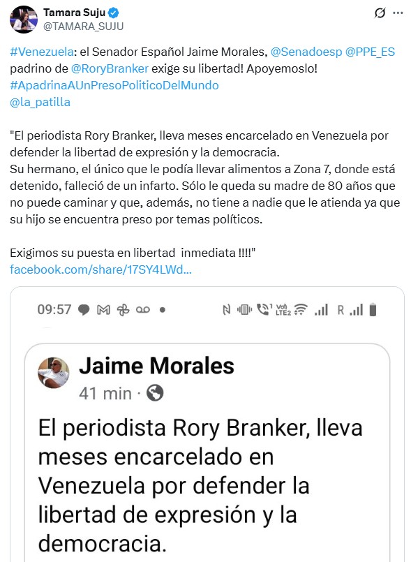 El Senador Español Jaime Morales, quien es padrino del periodista Rory Branker exige su libertad, lleva meses encarcelado en Venezuela por defender la libertad de expresión y la democracia.