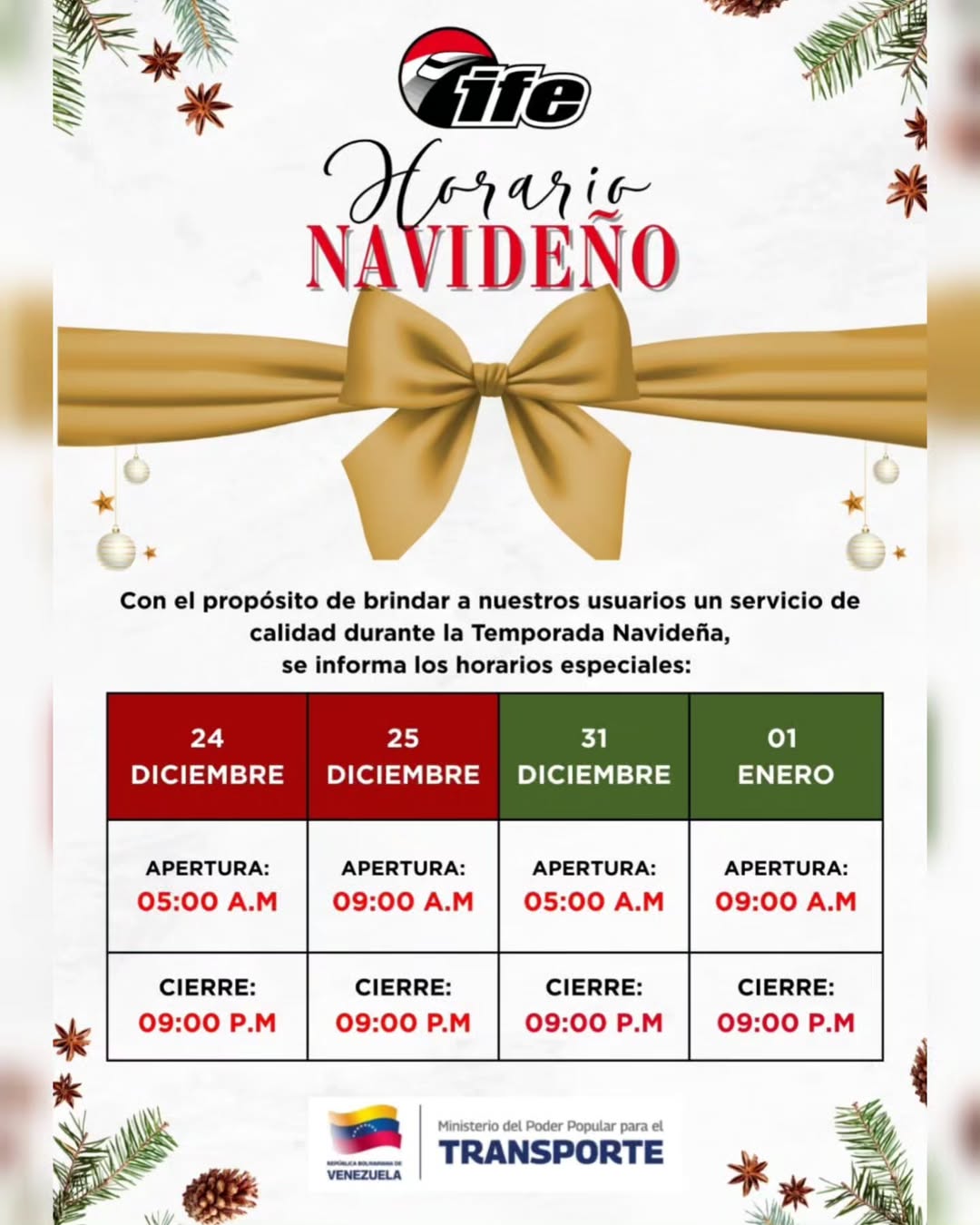 El Instituto de Ferrocarril del Estado (IFE) publicó a través de sus redes sociales el horario especial para los días feriados de la temporada decembrina, para que los usuarios tomen previsiones.