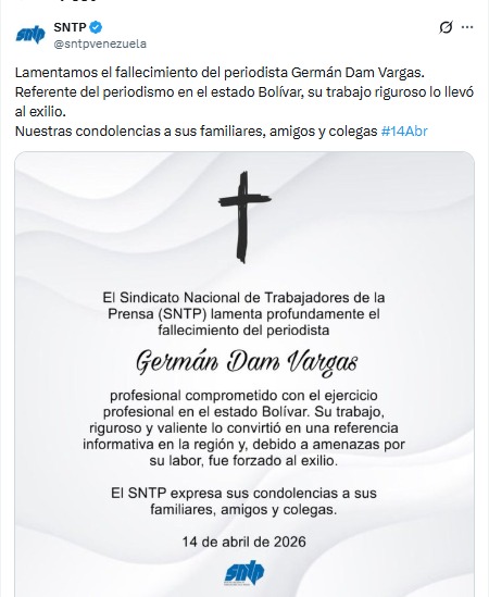 El Sindicato Nacional de Trabajadores de la Prensa lamentó este martes el fallecimiento de Germán Dam Vargas, reconocido profesional de la comunicación en el estado Bolívar.