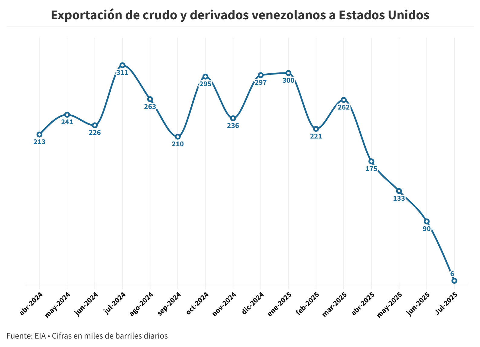 Las exportaciones petroleras venezolanas hacia Estados Unidos en julio fueron de 6.000 barriles diarios (bpd), una caída de 93% en contraste con el mes previo y la cantidad más baja desde que se retomaron los envíos en enero de 2023, de acuerdo con las cifras de la Administración de Información Energética (EIA, por sus siglas en inglés).