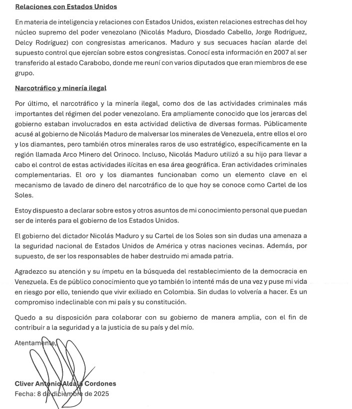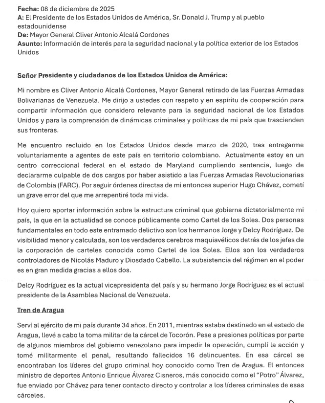 Mi nombre es Cliver Antonio Alcalá Cordones, Mayor General retirado de las Fuerzas Armadas Bolivarianas de Venezuela. Me dirijo a ustedes con respeto y en espíritu de cooperación para compartir información que considero relevante para la seguridad nacional de los Estados Unidos y para la comprensión de dinámicas criminales y políticas de mi país que trascienden sus fronteras.