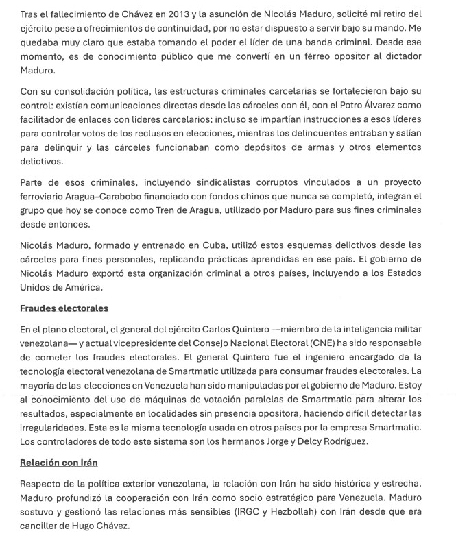 En el plano electoral, el general del ejército Carlos Quintero —miembro de la inteligencia militar venezolana—y actual vicepresidente del Consejo Nacional Electoral (CNE) ha sido responsable de cometer los fraudes electorales. El general Quintero fue el ingeniero encargado de la tecnología electoral venezolana de Smartmatic utilizada para consumar fraudes electorales. La mayoría de las elecciones en Venezuela han sido manipuladas por el gobierno de Maduro. Estoy al conocimiento del uso de máquinas de votación paralelas de Smartmatic para alterar los resultados, especialmente en localidades sin presencia opositora, haciendo difícil detectar las irregularidades. Esta es la misma tecnología usada en otros países por la empresa Smartmatic. Los controladores de todo este sistema son los hermanos Jorge y Delcy Rodríguez.