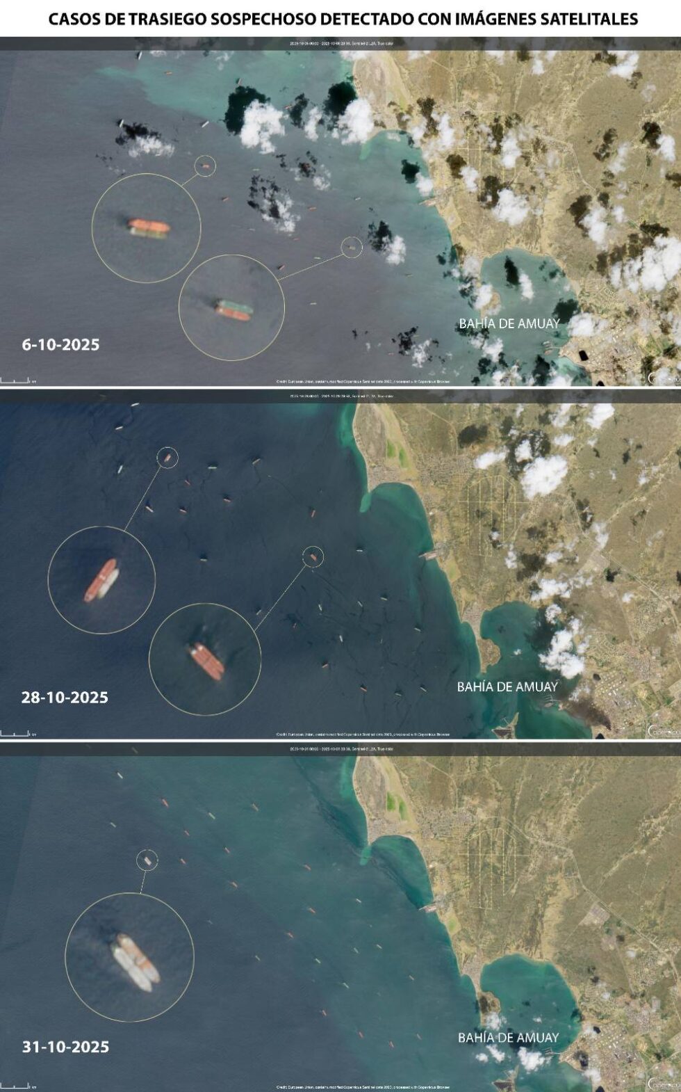 Este mismo método de observación permitió detectar un total de 6 operaciones de STS en octubre, la mayoría en la zona llamada Caquetíos, próxima a los muelles petroleros de la bahía de Amuay. Esto representa un incremento significativo con respecto al mes anterior, cuando solo fue posible confirmar 2 operaciones oscuras de trasiego por medio del rastreo de las señales AIS (sistema de identificación de señales de navíos) y de la detección visual con imágenes satelitales.