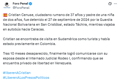 La ONG Foro Penal informó que tras diez meses de desaparición, un ciudadano rumano identificado como Cristian Cenuse, de 37 años logró comunicarse con su esposa para informarle que estaba detenido en Venezuela.