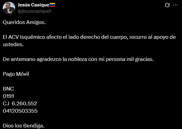 «Queridos Amigos. El ACV Isquémico afectó el lado derecho del cuerpo, recurro al apoyo de ustedes», escribió Casique en su cuenta de la red social X.