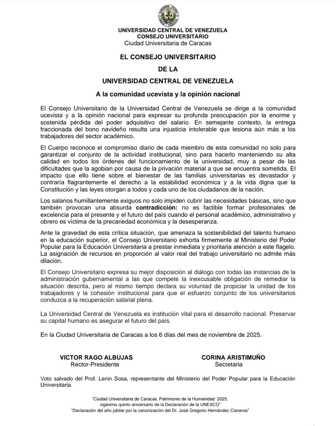 Este es el comunicado del Consejo Universitario de la UCV