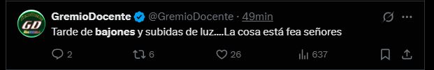 @GremioDocente, un perfil vinculado a educadores, posteó: «Tarde de bajones y subidas de luz… La cosa está fea señores».