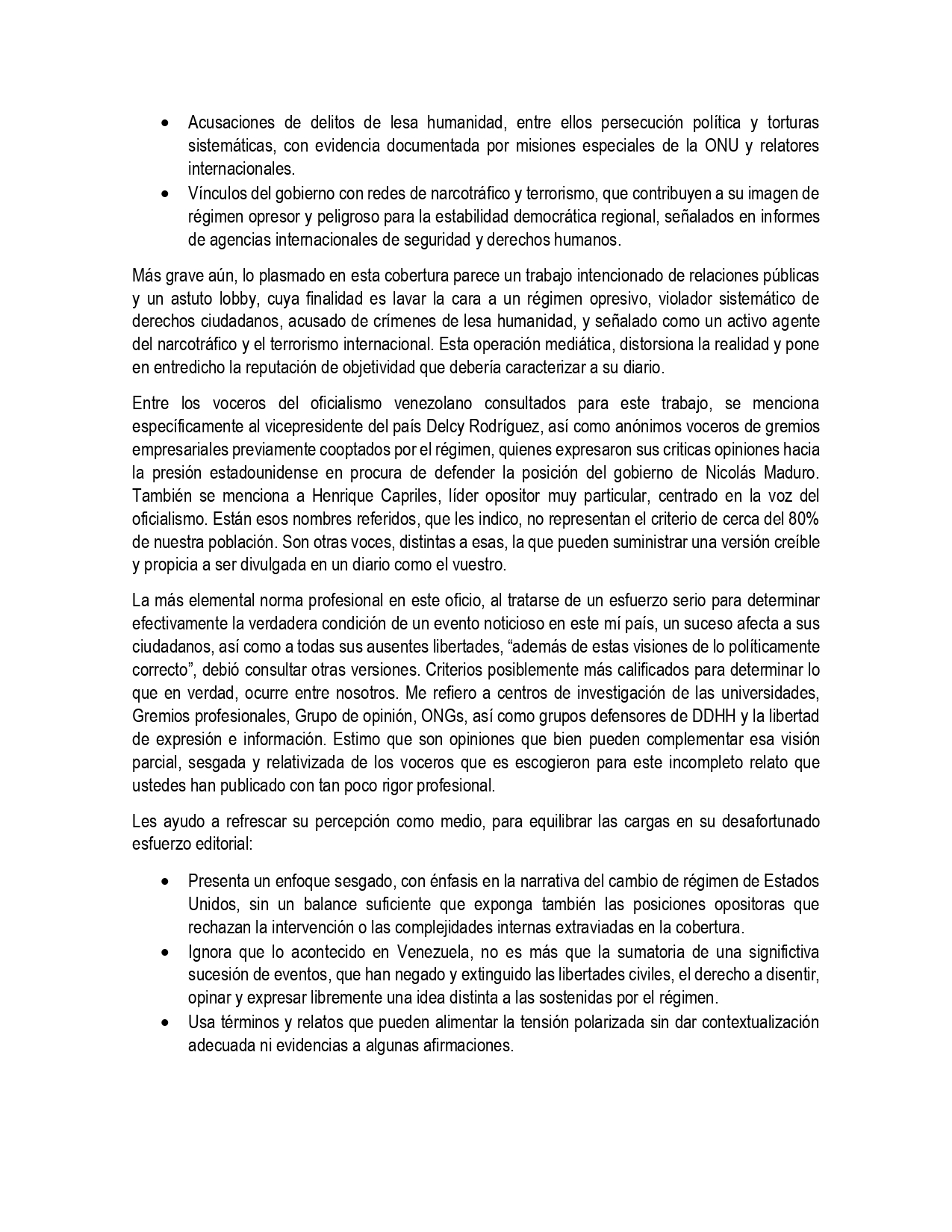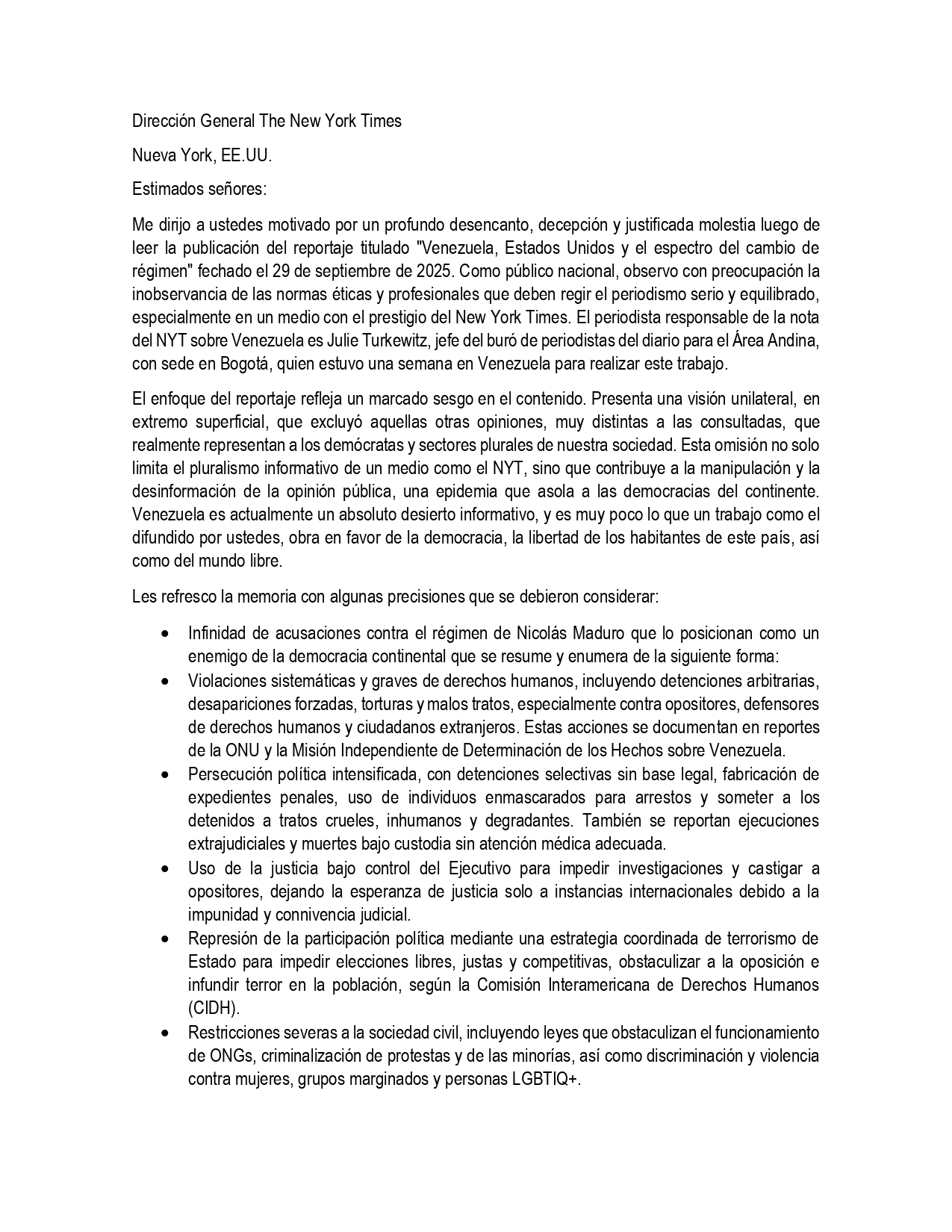 La misiva lista el contexto que, según los autores, The New York Times omitió. Se refieren a las «violaciones sistemáticas y graves de derechos humanos», documentadas por la ONU, la «persecución política intensificada» y el uso del sistema de justicia «bajo control del Ejecutivo para impedir investigaciones y castigar a opositores».