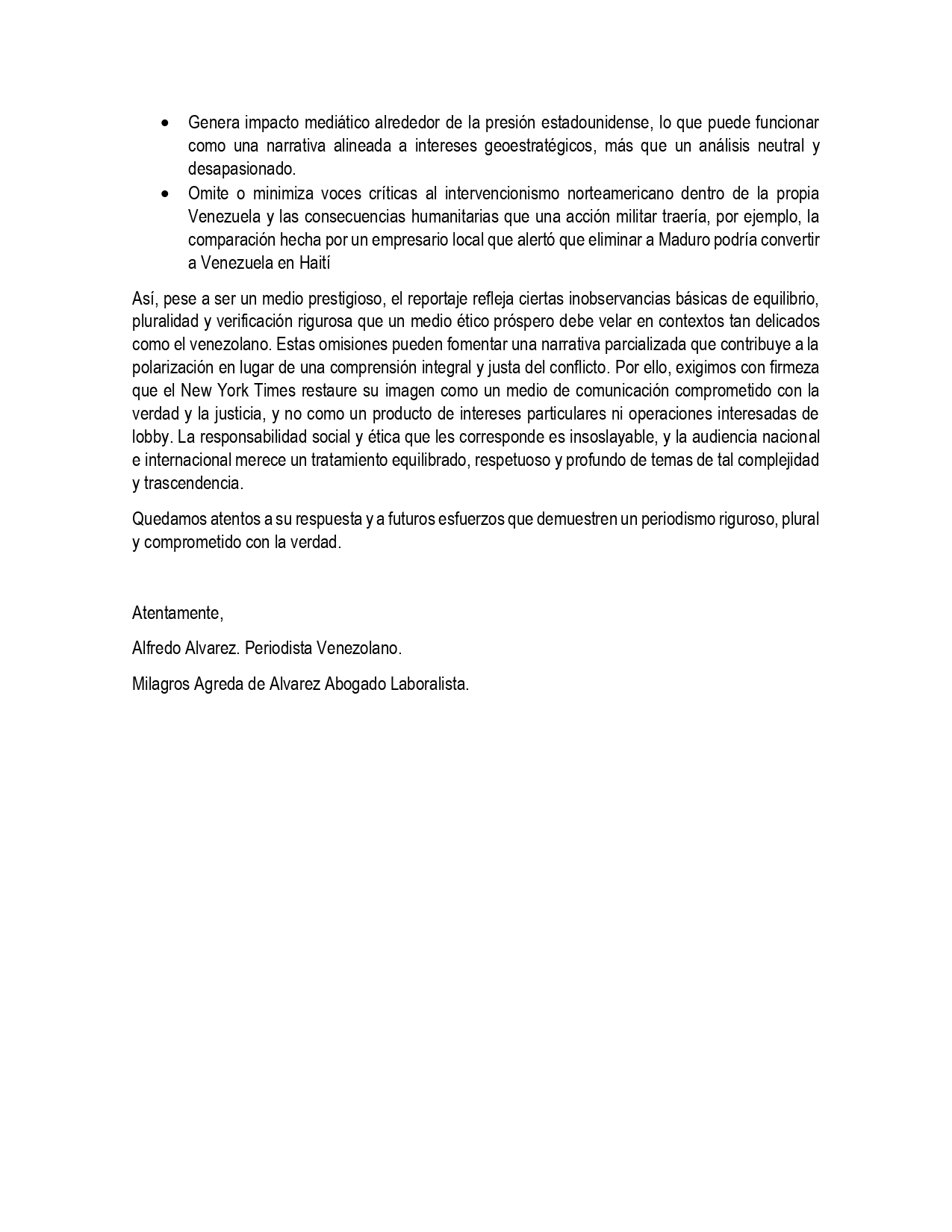Álvarez y Agreda acusaron que esta «operación mediática» distorsiona la realidad y pone «en entredicho la reputación de objetividad que debería caracterizar a su diario». A su juicio, el reportaje refleja una inobservancia básica de «equilibrio, pluralidad y verificación rigurosa» en un contexto tan delicado como el venezolano.