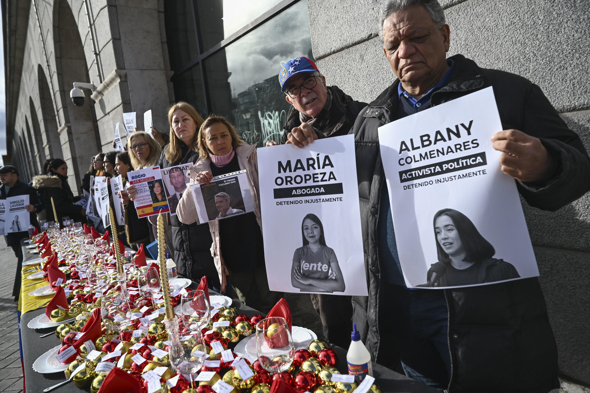 La diáspora venezolana dispuso este domingo en una calle de Madrid una larga mesa con los adornos habituales de la Navidad y algunos de los nombres de los presos políticos que no podrán celebrar las fiestas con sus familiares y seres queridos.