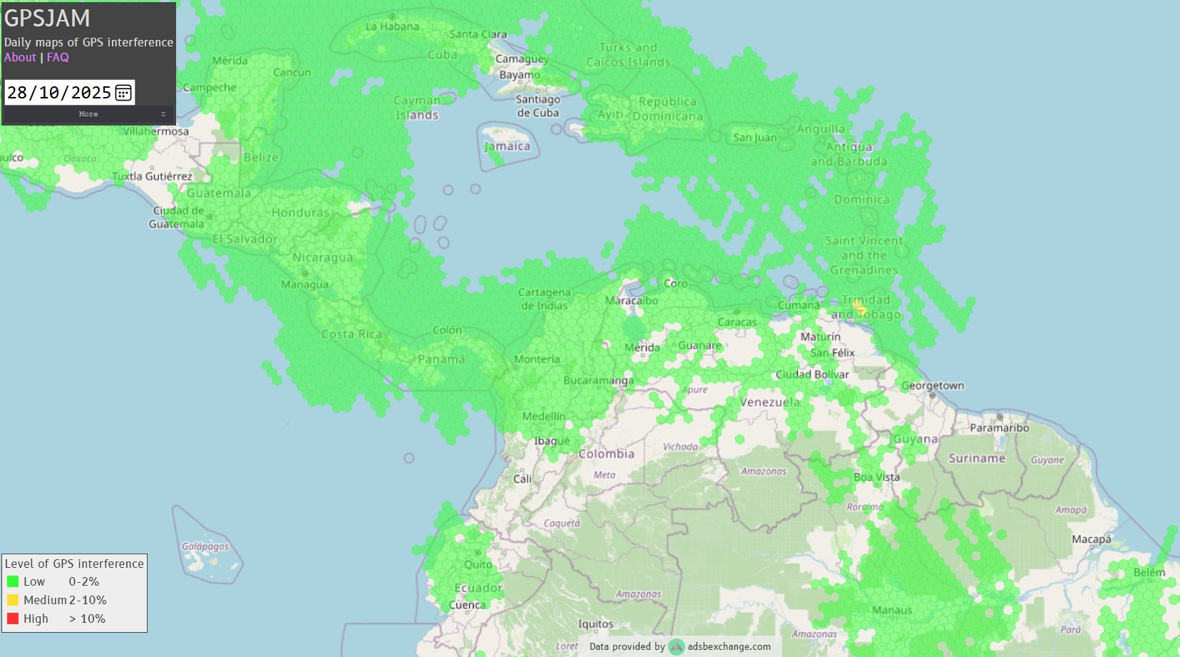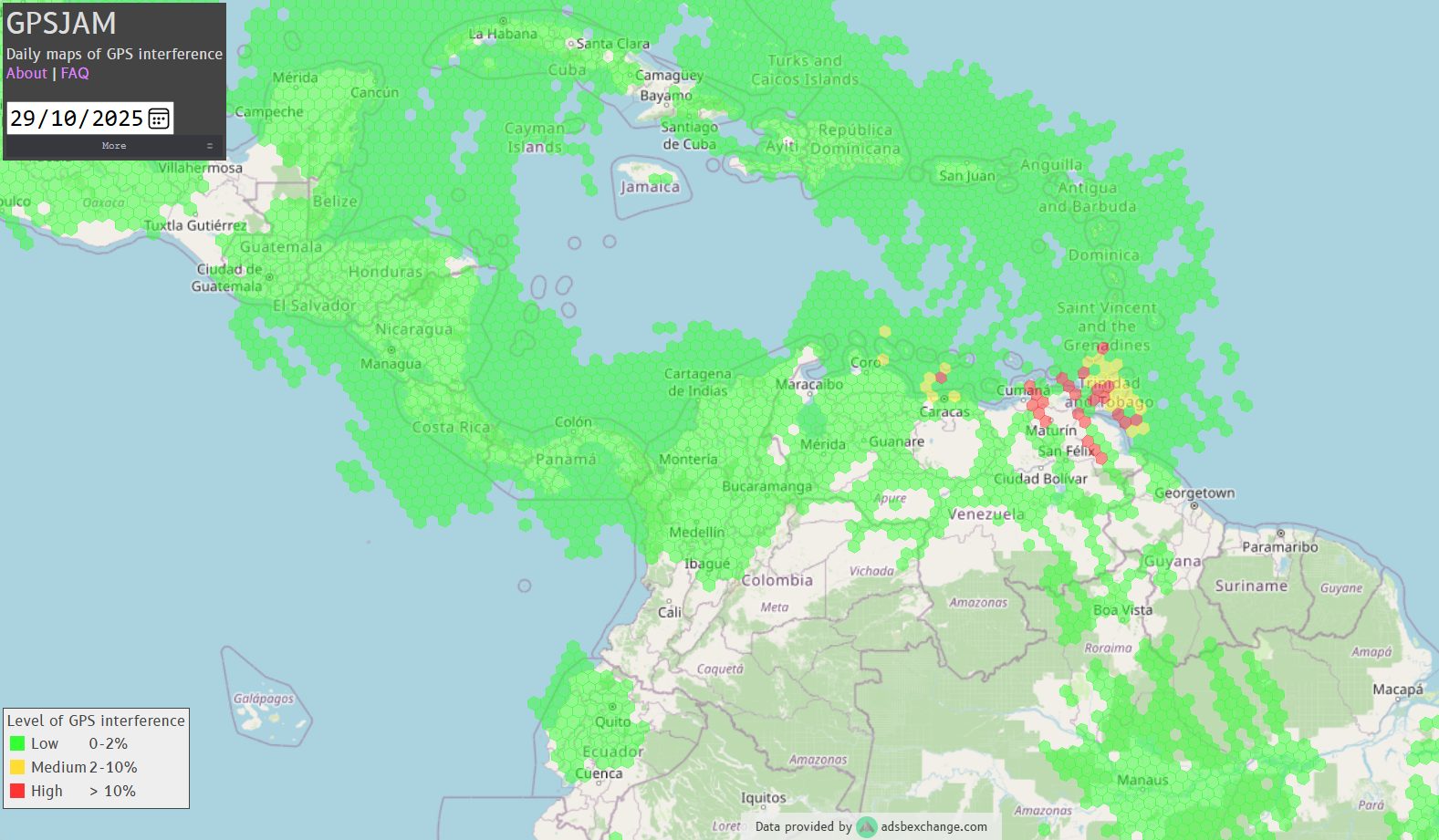 De acuerdo con GPSJAM, un sitio web especializado que usa datos proporcionados por ADS-B Exchange para generar mapas de posibles interferencias de GPS, alertó del hecho el pasado miércoles, lo que coincidía con los ejercicios militares realizados por el destructor estadounidense USS Gravely (DDG-107) en Trinidad y Tobago, a solo 11 kilómetros de la costa continental de Venezuela.