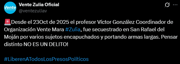 A través de su cuenta en X, Vente aseguró que González fue detenido el pasado 23 de octubre por «varios sujetos encapuchados y portando armas largas».