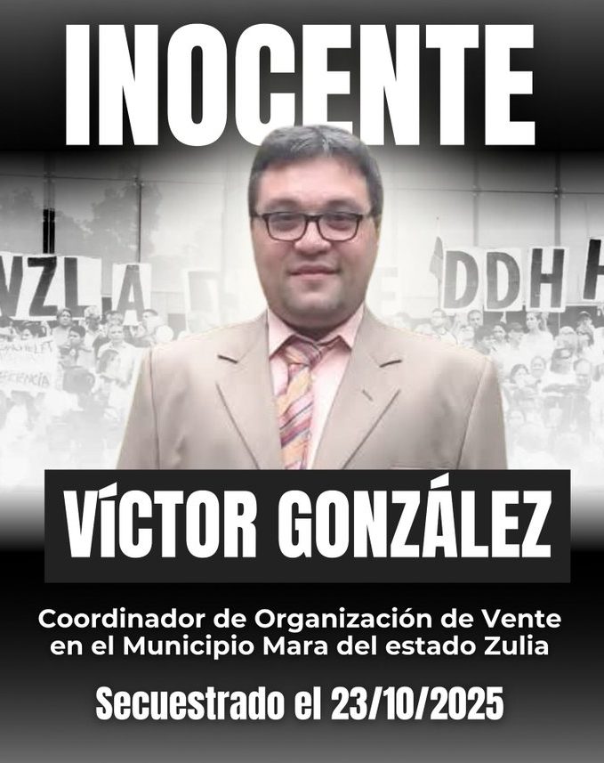 Vente Venezuela (VV), el partido de la líder opositora venezolana y Nobel de la Paz 2025, María Corina Machado, denunció este jueves la detención de Víctor González, su coordinador en el municipio Mara, estado Zulia, a quien considera inocente.