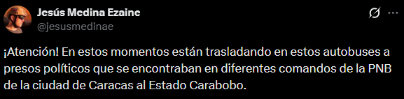 «¡Atención! En estos momentos están trasladando en estos autobuses a presos políticos que se encontraban en diferentes comandos de la PNB de la ciudad de Caracas al estado Carabobo», alertó en redes sociales el periodista Jesús Medina Ezaine.