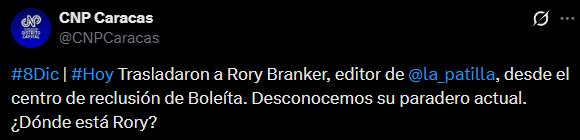 Asimismo, el Colegio Nacional de Periodistas (CNP) advirtió que «trasladaron a Rory Branker, editor de lapatilla, desde el centro de reclusión de Boleíta. Desconocemos su paradero actual».