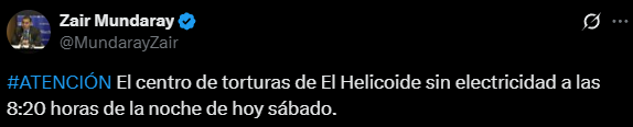 «El centro de torturas de El Helicoide sin electricidad a las 8:20 horas de la noche de hoy sábado», informó el abogado Zair Mundaray en su cuenta de X, donde adjuntó una grabación que corrobora su afirmación.
