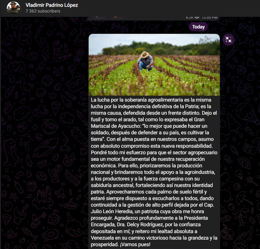 El exjefe castrense agradeció a Delcy Rodríguez por la confianza y reiteró su “lealtad absoluta a Venezuela en su camino victorioso hacia la grandeza y la prosperidad”, una línea que sonó más a despedida del uniforme que a plan concreto para rescatar el golpeado aparato agrícola nacional.
