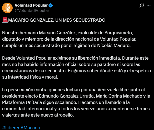 El partido Voluntad Popular denunció este domingo 12 de octubre que su dirigente nacional, el exalcalde de Barquisimeto Macario González, cumplió un mes «secuestrado por el régimen de Nicolás Maduro». A través de un comunicado, la organización exigió su liberación inmediata y alertó sobre la falta total de información oficial sobre su paradero.
