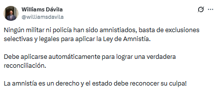 Williams Dávila denunció en X la aplicación discriminatoria y sesgada de la Ley de Amnistía en Venezuela.